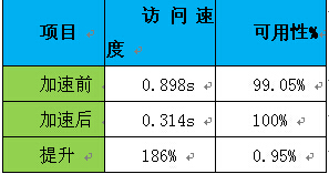 任何一个系统的管理者都希望系统的可用性到达100%,我们努力的是提高到接近100%的效果。整体的,不管是页面内容、官网、电商网站,还是应用下载,通过这样一个平台之后,整体的提速能够达到180%(表1),应该说还是相当可观的,这是一个大型企业的案例。