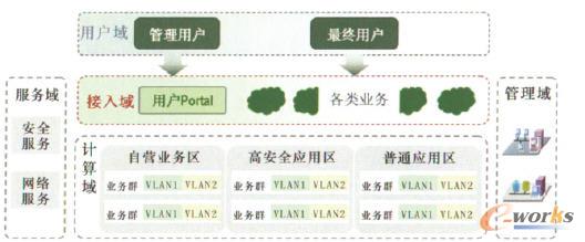 整个云网络划分为用户域、接入域、计算域、服务域和管理域,各域之间采用防火墙进行安全隔离。将虚拟主机按照用户等级划分安全区域,不同安全等级的虚拟机采用不同等级的安全保障方案。原则上不同安全等级的用户之间数据不能互访,虚拟机的数据迁移不能跨安全等级。
