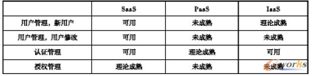 传统模式下的身份认证和访问管理技术已经比较成熟,云计算模式下服务商(IaaS、PaaS、SaaS)所支持的标准并不健全,难以满足企业对监测管理、隐私性和数据保护的需求。表1 显示了云计算几种运营模式下访问控制技术的成熟度。
