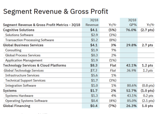 可以看到,除全球商业服务部门、硬件系统部门、其他部门营收小幅增长外,其他部门全线下滑。其中,技术服务及云平台部门营收最高,认知解决方案部门(包括解决方案软件和交易处理软件业务)毛利润率最高。
