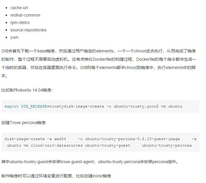 手动制作镜像非常麻烦和耗时,本文后面会介绍一个专门用于自动化构建镜像的项目DIB,通过DIB只需要在命令行上指定elements即可制作镜像,省去了重复下载镜像、启动虚拟机配置镜像的繁杂步骤。