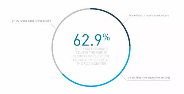 安全方面的顾虑也许是阻碍企业采用云的最大因素,但通常来说,IT专业人员认为公共云提供商很安全。大多数调查对象(62.9%)表示,公共云的安全性完全不亚于其自己的数据中心。