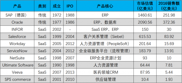 表:美国(SAP为德国)企业级市场行业参与状况(资料来源:公开数据整理)