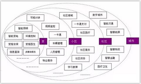 智慧城市被分成了四个“物联网(大小)层级”:家、小区、社区、城市(如上图)。这四层各有应用和服务,服务范围和覆盖区域从家到城市逐渐扩大。各层级中有部分应用相对独立,与上下层级无关;而另有一部分应用则会“层层升级”:家庭医生(家)>社区医疗(社区)>医疗卫生(城市)。