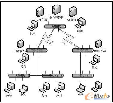 因工作需要,公司需建设一套局域网内的教育培训系统,用于开展员工的在线教育培训工作,以节约成本、提高工作效率。公司组织结构分为三层,一级机构下设多个二级营销部,每个营销部下设若干个市场部,员工总数近一千人。各级单位联网办公,网络结构图如图3所示。由于在地理位置上距离较远,二级、三级单位通过*** 方式连接至一级单位。核心网络千兆交换,下级单位*** 连接带宽为2M。