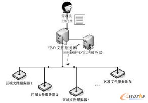 整个网络中存在多台文件服务器,在工作过程中,管理员只将文件发布到中心文件服务器上,其它子文件服务器由系统根据培训任务,自动将相应的培训资料下发至对应的子文件服务器。