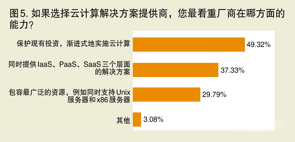 谈到对云计算解决方案提供商的能力要求,49.32%的企业注重“保护现有投资,渐进式地实施云计算”(参考图5),但这一点对云计算解决方案提 供商而言,其实是基本要求,几乎所有的云计算厂商都会拿出两套方案,一套是帮助用户渐进式地实施云计算,另一套就是“开箱即用”的软硬件一体化云 计算解决方案。该项调查中值得重视的是,有29.79%的受访者希望云平台“包容最广泛的资源,例如同时支持Unix服务器和x86服务器”。这 是一个非常现实的问题,因为绝大多数企业用户的数据中心里,Unix服务器与x86服务器将长期并存,尤其那些大中型企业,小型机的比重还比较 高。因此,能同时支持Unix服务器和x86服务器的云解决方案必然受到这些企业用户的青睐,这也意味着IBM等厂商具有先天优势。此外,有8.2%的受访者表示会基于开源云计算软件自主开发云平台。虽然这个数字并不多,但开源云计算技术的兴起是一股不可小觑的力量。支付宝、 天涯社区、上海交通大学等一些具有强大研发能力的企事业机构,均采用开源的云计算技术来搭建自己的云平台。戴尔等厂商也推出基于开源技术的云解决 方案。