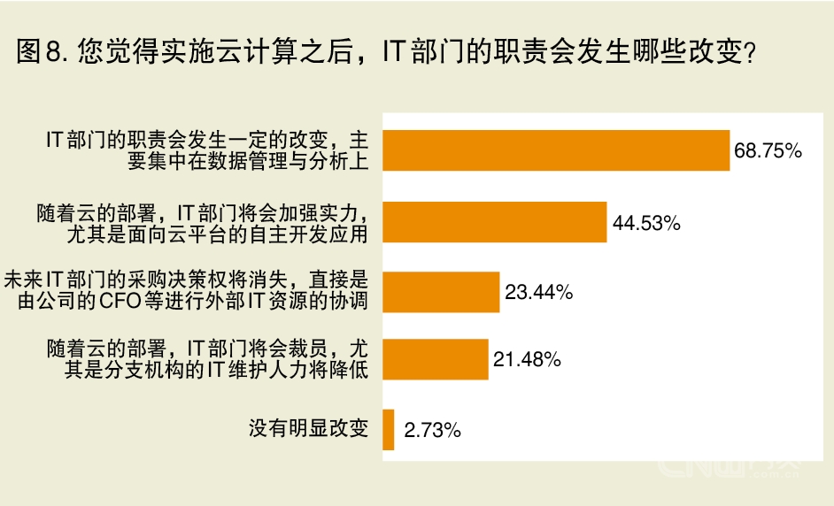 [page] 云计算会给IT运维带来哪些改变?调查结果也很有意思——虽然66.41%的受访者认为运维人员要学习很多新的知识,但68.75%的受访者仍然 相信IT运维会变轻松(参考图7),甚至有21.48%的受访者认为云计算利于IT部门实施人员精简(参考图8),尤其是削减分支机构的IT运维 人员。同时,68.75%的受访者认为云计算能够让IT部门能将更多精力从日常IT运维抽离出来,集中在数据管理与分析上,从而让IT部门与业务 部门走得更近。