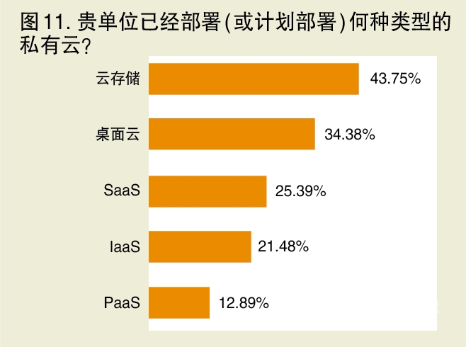 本次调研中比较令人意外的调查结果是,无论是部署私有云还是选择公有云服务,云存储居然都是企业用户的首选,而并非笔者事先以为的IaaS(参考 图11、图12)。当然,选择PaaS(平台即服务)最少倒是可以理解,因为需要创建PaaS的企业用户还是比较少。