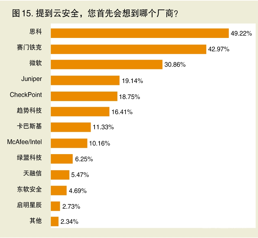 本次调查再次验证,云安全果然是用户最担心的问题——高达67.97%的受访者将数据安全性视为向私有云迁移时最顾虑的问题(参考图13)。同 时,52.73%的受访者认为虚拟化安全是云计算安全控制的难点(参考图14)。