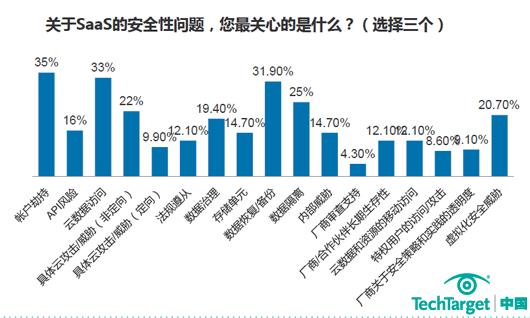 没有采用SaaS的企业则表示主要由于担心安全问题,针对SaaS而言,主要是特权用户攻击、缺乏安全意识(27.4%)。关于SaaS的安全性问题,受访者最关心的三个问题分别为:账户劫持(34.9%)、云数据访问(33.2%)和数据恢复/备份(31.9%)。我们发现无论是PaaS、IaaS还是SaaS,数据恢复/备份都是用户关注的焦点。