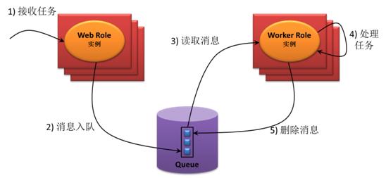 Windows Azure的计算资源目前是通过成为Web Role和Work Role的方式来分配的。为了便于理解,我们可以认为Web Role和Worker Role是两种不同的虚拟机模版。其中Web Role是为了方便运行Web应用程序而设计的,而Work Role是为了其他应用类型,比如批处理而设计的。一种比较常见的架构设计方式是使用Web Role来处理展示逻辑,而通过Worker Role来进行业务逻辑处理。Web Role负责客户端的HTTP请求,为了支持应用的扩展,Web Role上的应用一般会设计为无状态的,从而使得系统可以方便的增加Web Role实例数量,提高应用的并发处理能力。
