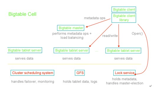 在结构上,BigTable基于GFS分布式文件系统和Chubby分布式锁服务。BigTable主要分为两部分:其一是Master节点,用来处理元数据相关的操作并支持负载均衡。其二是Tablet节点,主要用于存储数据库的分片tablet,并提供相应的数据访问,同时tablet是基于名为SSTable的格式,对压缩有很好的支持。下图为其具体的架构图: