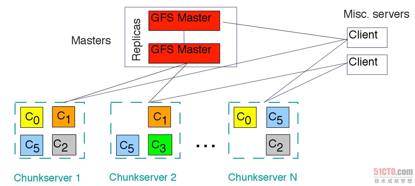 支持容错:首先,虽然当时为了设计方便,采用了单Master的方案,但是整个系统会保证Master节点会有其相对应的替身(Shadow),以便于当Master节点出现问题时进行切换。其次,在Chunk层,GFS已经在设计上将节点失败视为常态,所以能非常好地处理Chunk节点失效的问题。