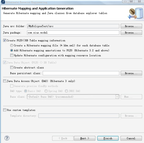 看选项:java src folder 源码包,不用多解释,java package——存放将要反转出来的实体类,选择目录(应该是提前建好的com.xxx.model之类的包);Create pojo<>db。。。这个选项选中,就是我们建立从表到简单java 对象(即pojo)的配置,把下面的add hibernate mapping annotations to pojo的选上,其它不管,这个选项用来“添加映射注解到pojo对象上”,它上面的那个选项用来创建xml的。