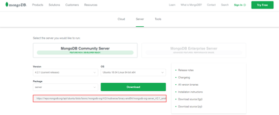 # 更新 apt-get update # 下载curl apt-get install curl # 下载mongodb官网对应linux版本的压缩包 get curl -O https://fastdl.mongodb.org/linux/mongodb-linux-x86_64-ubuntu1804-4.2.1.tgz # 解压mongo压缩包 tar -zxvf mongodb-linux-x86_64-ubuntu1804-4.2.1.tgz # 移动解压文件到全局安装目录 mv mongodb-linux-x86_64-ubuntu1804-4.2.1.tgz /usr/local/mongodb # 设置path路径 export PATH=/usr/local/mongodb/bin:$PATH