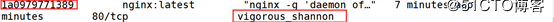 [root@localhost ~]# docker run -itd nginx:latest //不加任何参数开启一台nginx虚拟机 [root@localhost ~]# docker ps //查看容器信息