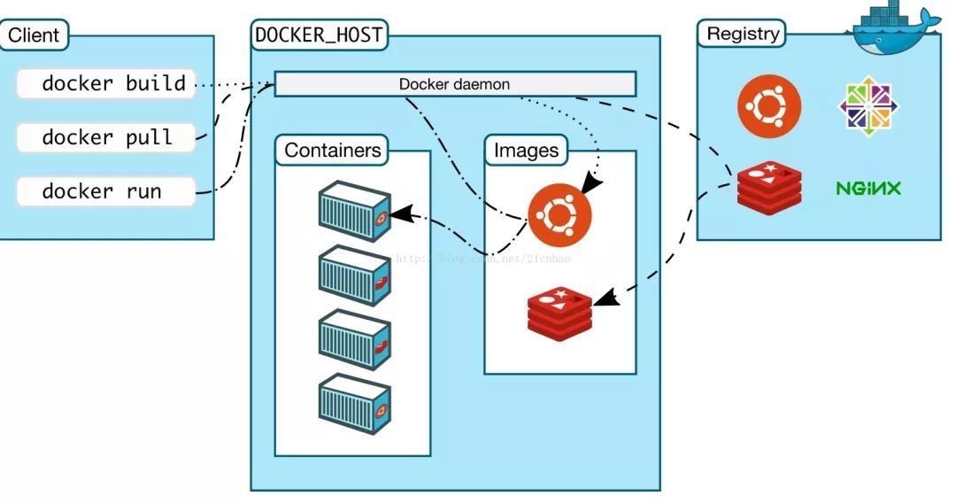 Docker客户端是Docker的用户界面,它可以接受用户命令和配置标识,并与Docker daemon通信。图中,docker build等都是Docker的相关命令。