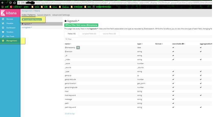 容器启动后用浏览器访问5601端口,可以看到kibana页面,首次访问的时候可能会提示没有建立默认索引,这里需要在管理页面上创建一个默认索引。默认索引通常叫做logstash-*,如下图所示创建一个默认索引。