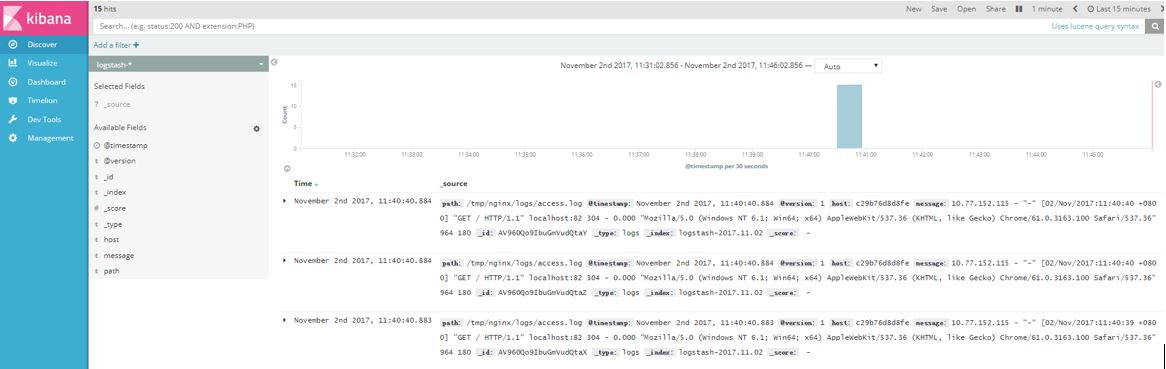 再往后,打开Kibana页面就可以看到实时写入的日志数据了: