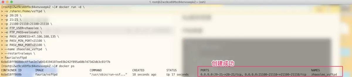 docker run -d \ -v /share:/home/vsftpd \ -p 20:20 \ -p 21:21 \ -p 21100-21110:21100-21110 \ -e FTP_USER=zhaoolee \ -e FTP_PASS=eelooahz \ -e PASV_ADDRESS=47.106.108.135 \ -e PASV_MIN_PORT=21100 \ -e PASV_MAX_PORT=21100 \ --name zhaoolee_vsftpd \ --restart=always \ fauria/vsftpd