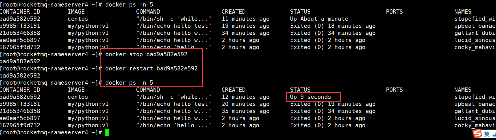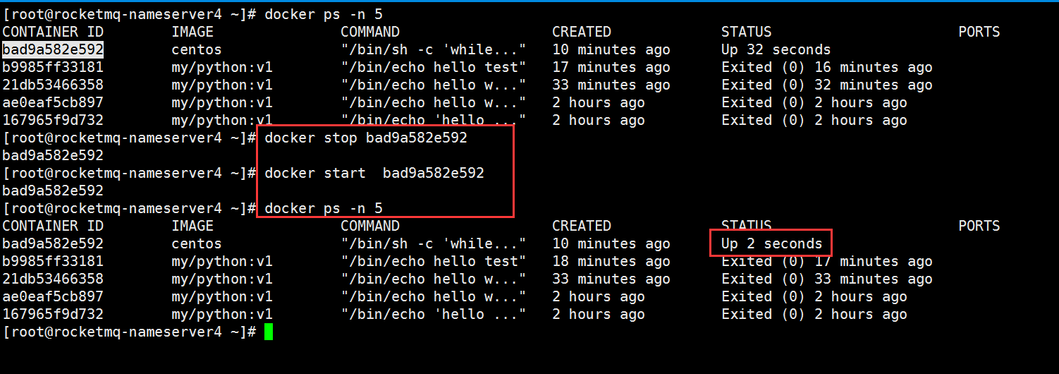 命令执行完,控制台会打印"hello test",container就终止了,不过并没有消失,可以用"docker ps -n 5 "看一下最新前5个的container,第一个就是刚刚执行过的container,可以再次执行一遍:docker start container_id