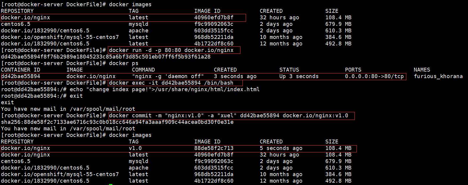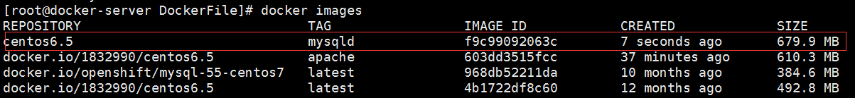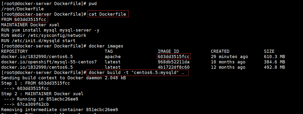 mkdir DockerFile cd DockerFile cat > Dockerfile <<EOF FROM 603dd3515fcc MAINTAINER Docker xuel RUN yum install mysql mysql-server -y RUN mddir /etc/sysconfig/network RUN /etc/init.d/mysqld start EOF
