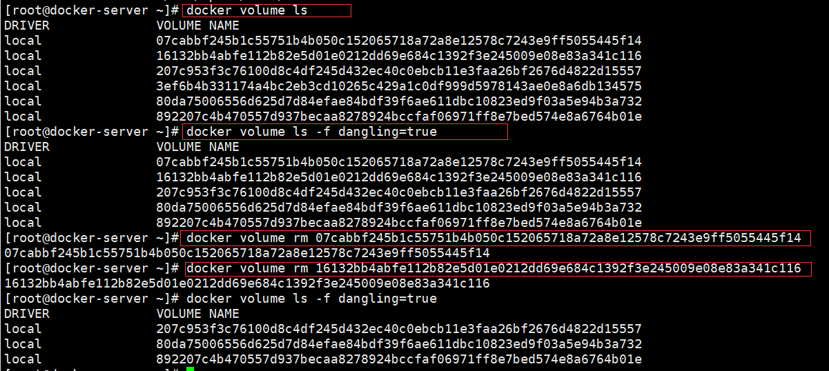 docker volume ls #查看数据盘 docker volume ls -f dangling=true #查看未被容器使用的数据盘 docker volume rm VOLUME NAME #删除数据盘