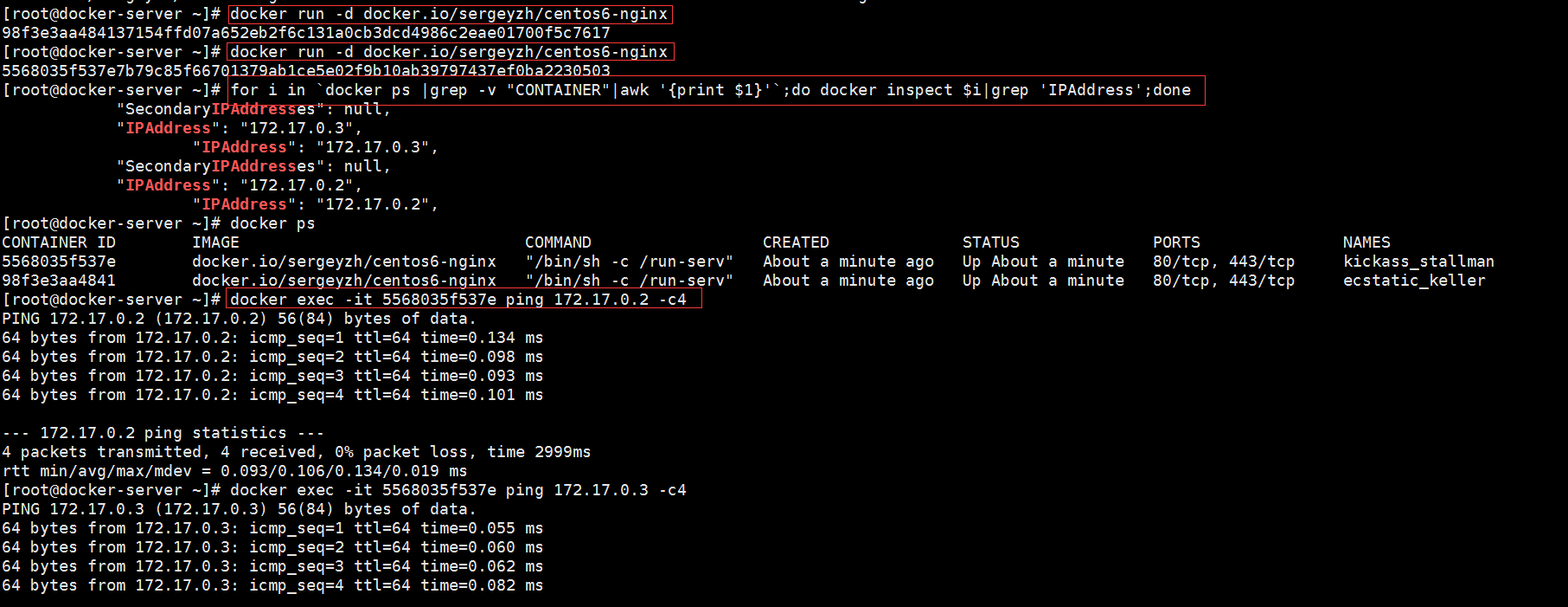 查看桥接模式下主机内部容器之间和容器与宿主机直接均可正常通讯