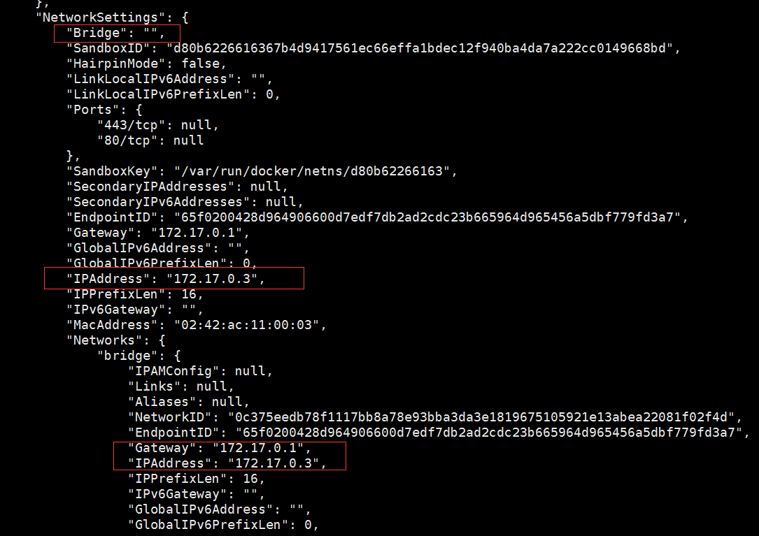 如果想让外界可以访问到,基于bridge网络创建的容器提供的服务,那你可以告诉Docker你要使用哪些接口。如果想查看镜像会使用哪些端口,ExposedPorts,可以获悉镜像使用哪些端口。