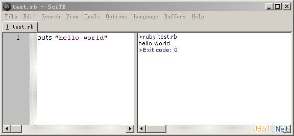 安装SciTE后,打开它,我们输入代码 puts "hello world" ,点击菜单=>file=>save 保存文件为test.rb。 然后按键盘F5,右侧输出窗口出现结果。如图: