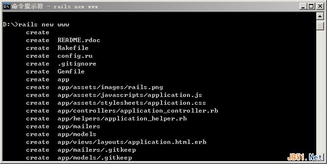 打开CMD提示窗口,进入D盘,输入指令:rails new www ,会在D盘创建名称为www 的rails项目结构。