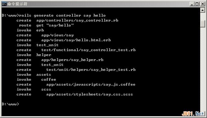Rails是一个MVC框架,Rails接收来自浏览器的请求,对请求进行解读以找到合适的控制器,再调用控制器中合适的方法。然后,控制调用合适的视图,把结果显示给用户。Rails提供了快速创建视图和控制的方法,打开CMD命令窗口。进入到刚才的www项目目录,输入命令:rails generate controller say hello 如图: