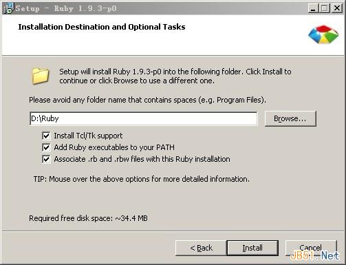这里我们选择安装路径为 d:\ruby。 下面有3个选项分别是:(1) 是否安装tcltk支持。(2) 添加ruby命令路径到系统环境变量path。(3)是否将 .rb 和.rbw 文件关联到ruby。