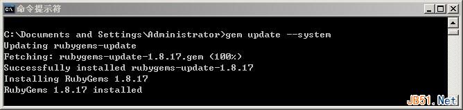 较新的ruby版本已经包含rubygems了,因此我们不用手动下载安装了。只需在cmd窗口输入指令:gem update --system ,耐心等待一段时间,已有的rubygems会更新到目前最新的版本。如图。