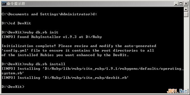 2) 打开 cmd 窗口,进入 d:\devkit 目录,输入ruby dk.rb init 。#生成config.yml,这里会检查将要添加devkit支持的ruby列表,只支持通过rubyinstaller安装的ruby。