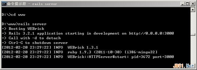 接着进入www目录,输入指令:rails server ,启动rails自带的 webrick 服务器。如图: