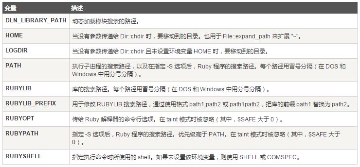 ruby 解释器使用下列环境变量来控制它的行为。env 对象包含了所有当前设置的环境变量列表。