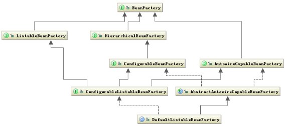BeanFactory 有三个子类:ListableBeanFactory、HierarchicalBeanFactory 和 AutowireCapableBeanFactory。但是从上图中我们可以发现最终的默认实现类是 DefaultListableBeanFactory,他实现了所有的接口。那为何要定义这么多层次的接口呢?查阅这些接口的源码和说明发现,每个接口都有他使用的场合,它主要是为了区分在 Spring 内部在操作过程中对象的传递和转化过程中,对对象的数据访问所做的限制。例如 ListableBeanFactory 接口表示这些 Bean 是可列表的,而 HierarchicalBeanFactory 表示的是这些 Bean 是有继承关系的,也就是每个 Bean 有可能有父 Bean。AutowireCapableBeanFactory 接口定义 Bean 的自动装配规则。这四个接口共同定义了 Bean 的集合、Bean 之间的关系、以及 Bean 行为。