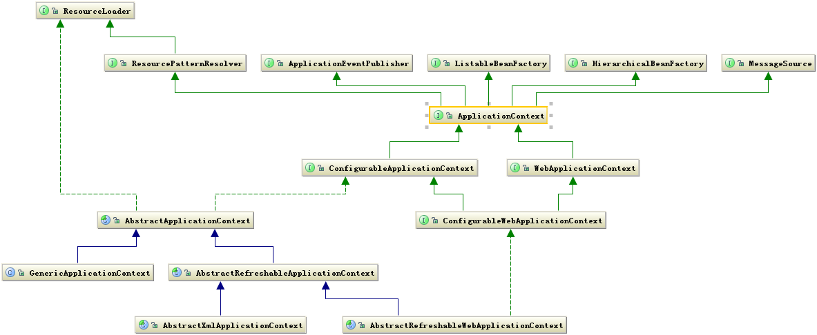 从上图中可以看出?ApplicationContext?继承了 BeanFactory,这也说明了 Spring 容器中运行的主体对象是 Bean,另外?ApplicationContext?继承了 ResourceLoader 接口,使得?ApplicationContext?可以访问到任何外部资源,这将在 Core 中详细说明。