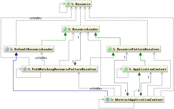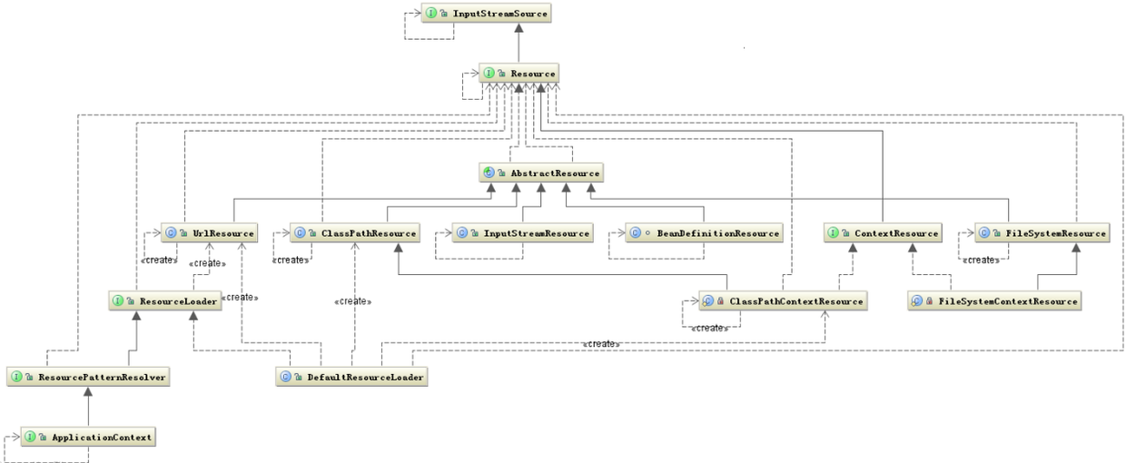 从上图可以看出 Resource 接口封装了各种可能的资源类型,也就是对使用者来说屏蔽了文件类型的不同。对资源的提供者来说,如何把资源包装起来交给其他人用这也是一个问题,我们看到 Resource 接口继承了?InputStreamSource?接口,这个接口中有个 getInputStream 方法,返回的是 InputStream 类。这样所有的资源都被可以通过 InputStream 这个类来获取,所以也屏蔽了资源的提供者。另外还有一个问题就是加载资源的问题,也就是资源的加载者要统一,从上图中可以看出这个任务是由 ResourceLoader 接口完成,他屏蔽了所有的资源加载者的差异,只需要实现这个接口就可以加载所有的资源,他的默认实现是?DefaultResourceLoader。