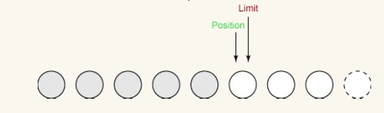 在第一次写入时,我们从缓冲区中取四个字节并将它们 写入输出通道。这使得position增加到4,而limit不变,如下所示:
