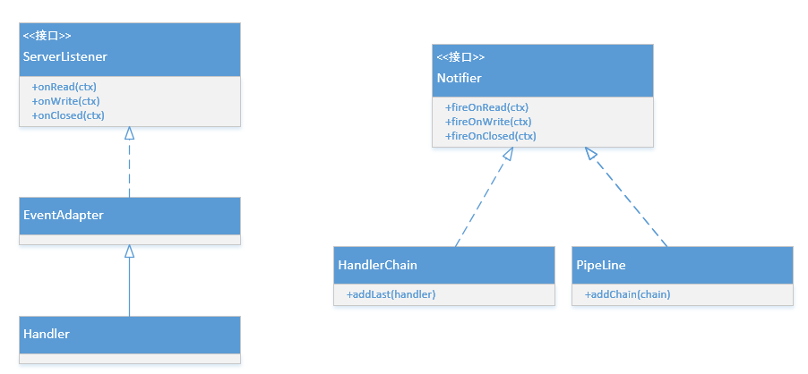 如下图:整个事件模型由监听器、事件适配器、事件触发器(HandlerChain,PipeLine)、事件处理器组成。