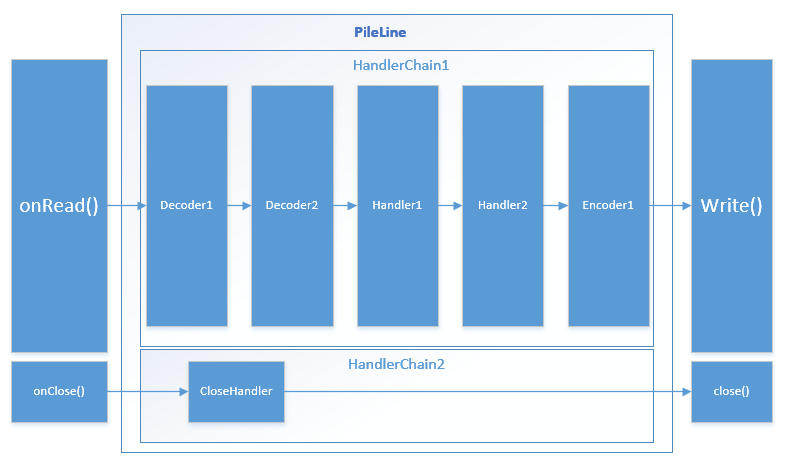 事件处理采用职责链模式,每个处理器处理完数据之后会决定是否继续执行下一个处理器。如果处理器不将任务交给线程池处理,那么整个处理流程都在同一个线程中处理。而且每个连接都有单独的PipeLine,工作线程可以在多个连接上下文切换,但是一个连接上下文只会被一个线程处理。
