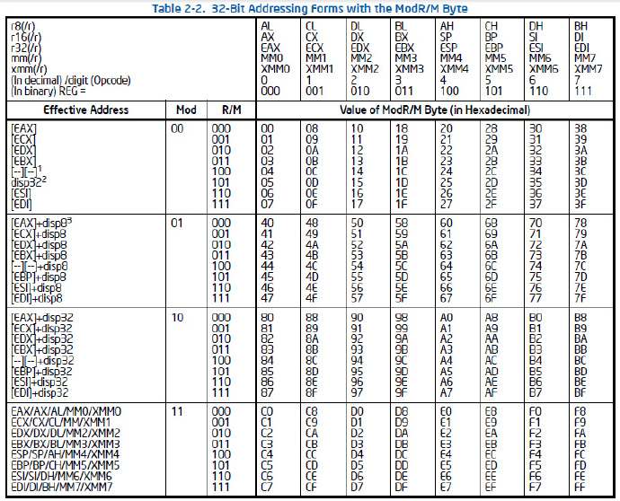 - The disp32 nomenclature denotes a 32-bit displacement that follows the ModR/M byte (or the SIB byte if one is present) and that is