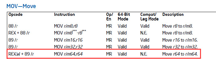 MOV r/m64,r64 //64位,将寄存器中的值给到寄存器或者内存地址中