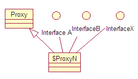 首先是动态生成的代理类本身的一些特点。1)包:如果所代理的接口都是 public 的,那么它将被定义在顶层包(即包路径为空),如果所代理的接口中有非 public 的接口(因为接口不能被定义为 protect 或 private,所以除 public 之外就是默认的 package 访问级别),那么它将被定义在该接口所在包(假设代理了 com.ibm.developerworks 包中的某非 public 接口 A,那么新生成的代理类所在的包就是 com.ibm.developerworks),这样设计的目的是为了最大程度的保证动态代理类不会因为包管理的问题而无法被成功定义并访问;2)类修饰符:该代理类具有 final 和 public 修饰符,意味着它可以被所有的类访问,但是不能被再度继承;3)类名:格式是“$ProxyN”,其中 N 是一个逐一递增的阿拉伯数字,代表 Proxy 类第 N 次生成的动态代理类,值得注意的一点是,并不是每次调用 Proxy 的静态方法创建动态代理类都会使得 N 值增加,原因是如果对同一组接口(包括接口排列的顺序相同)试图重复创建动态代理类,它会很聪明地返回先前已经创建好的代理类的类对象,而不会再尝试去创建一个全新的代理类,这样可以节省不必要的代码重复生成,提高了代理类的创建效率。4)类继承关系:该类的继承关系如图: