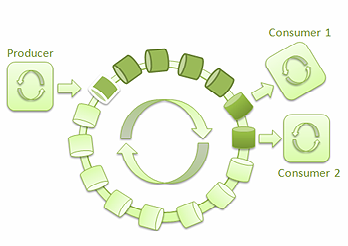 下面是有多个生产者写入环形缓冲区,多个消费者从中读取消息的场景。