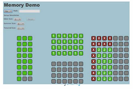 Ben Evans进行了一系列的动画演示。第一个演示是个Flash,说明了对象在Eden区和一个新生代Survivor空间之间移动,并最终进入老年代的过程。
