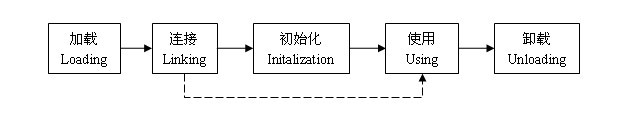 一个java类的完整的生命周期会经历加载、连接、初始化、使用、和卸载五个阶段,当然也有在加载或者连接之后没有被初始化就直接被使用的情况,如图所示: